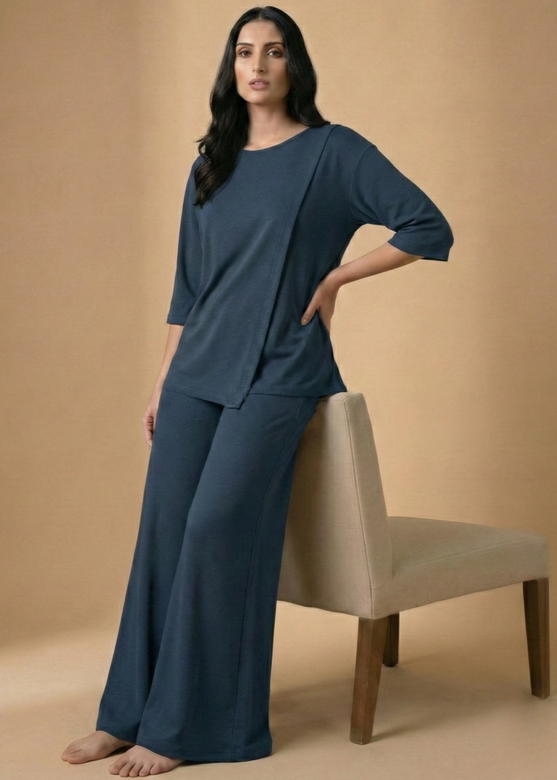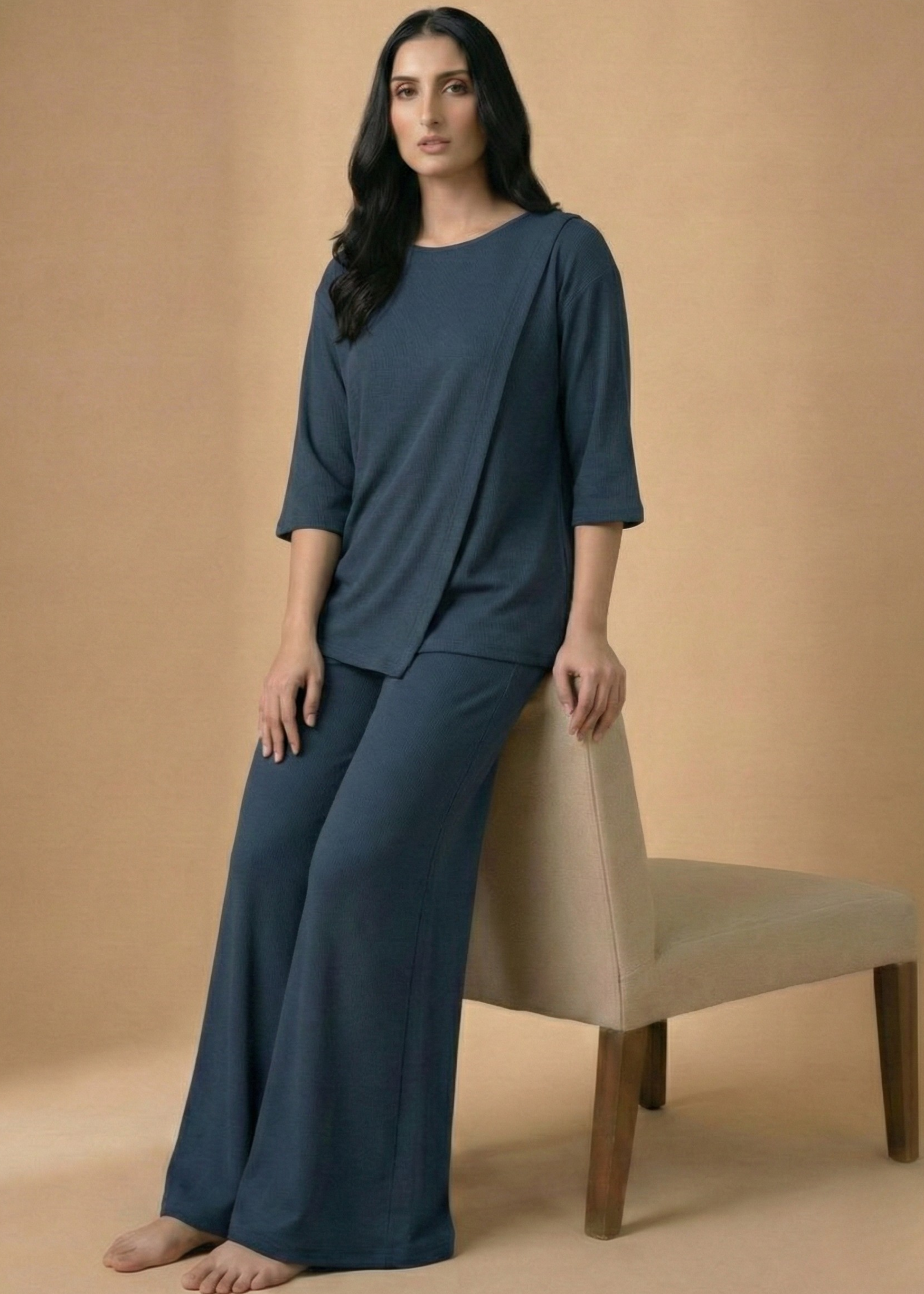 The standout feature—a distinct, off-center vertical seam—creates a "parallel" visual interest that draws the eye and lengthens the frame. With its refined elbow-length sleeves and sweeping wide-leg trousers, this set transitions seamlessly from a serene morning at home to a polished afternoon in the city.