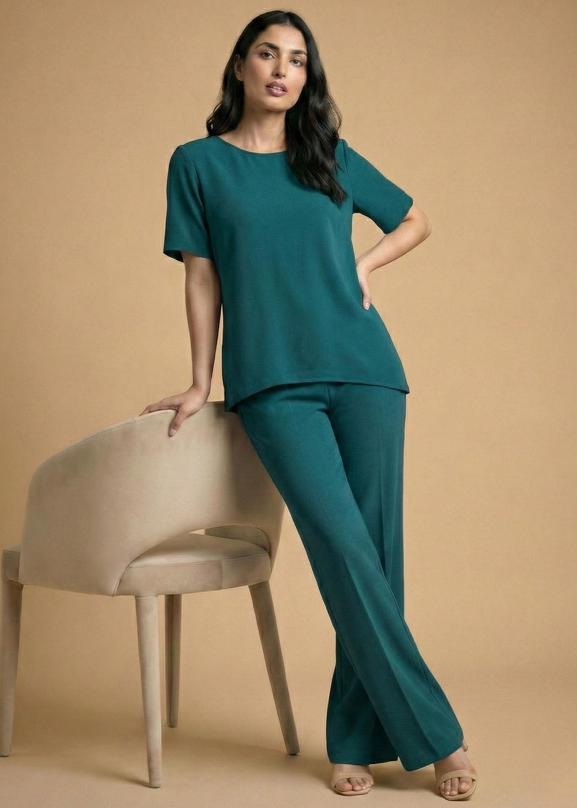 The ELEVATE CO-ORD SET is designed for the woman who values structure, softness, and quiet confidence. Featuring a fluid, relaxed-fit top paired with elongated wide-leg trousers, the silhouette creates a clean vertical line that flatters effortlessly.