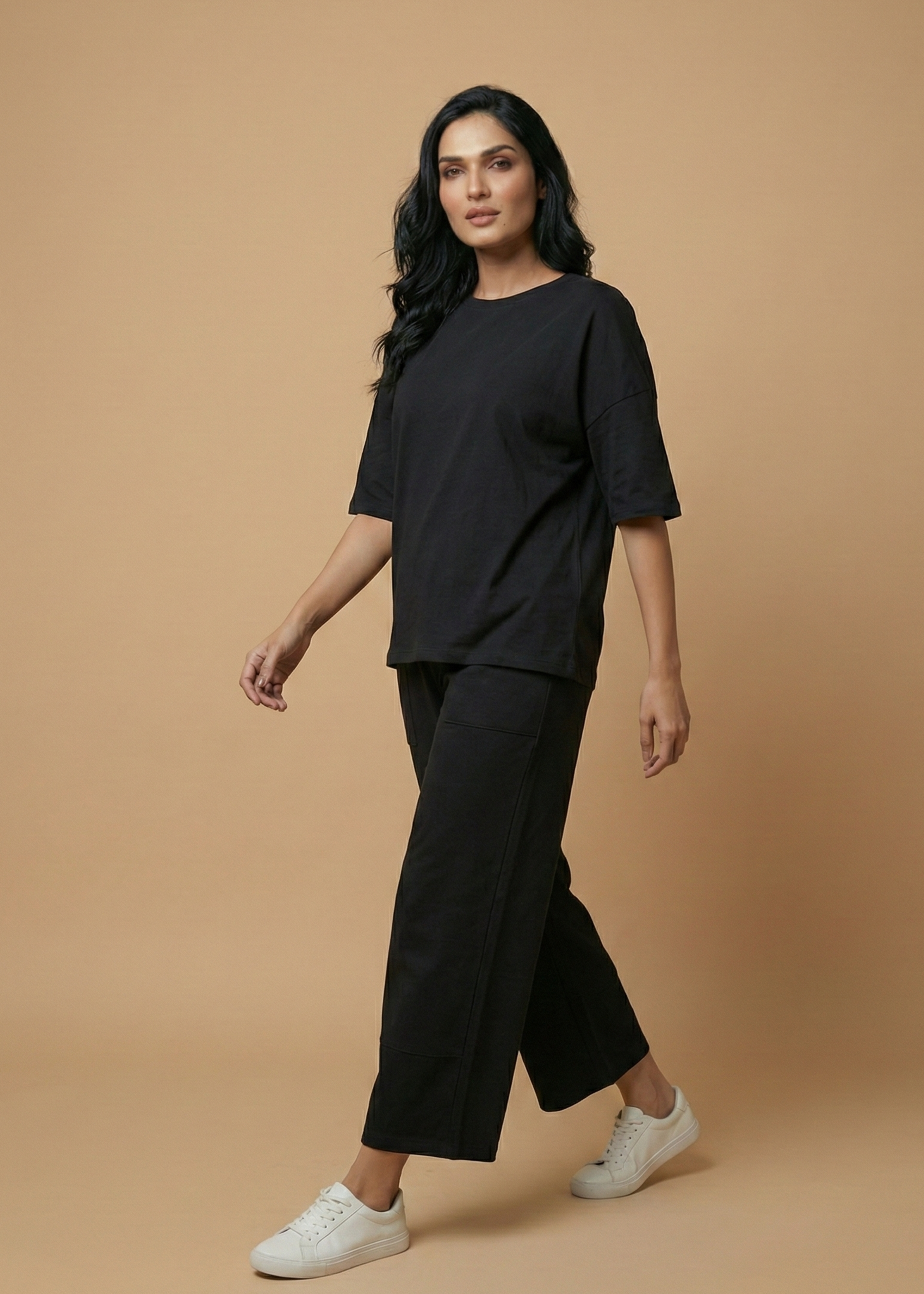 Relaxed Silhouette: Enjoy a roomy crew-neck top with dropped shoulders and flowing, wide-legged trousers featuring an adjustable waistband and discreet side pockets.