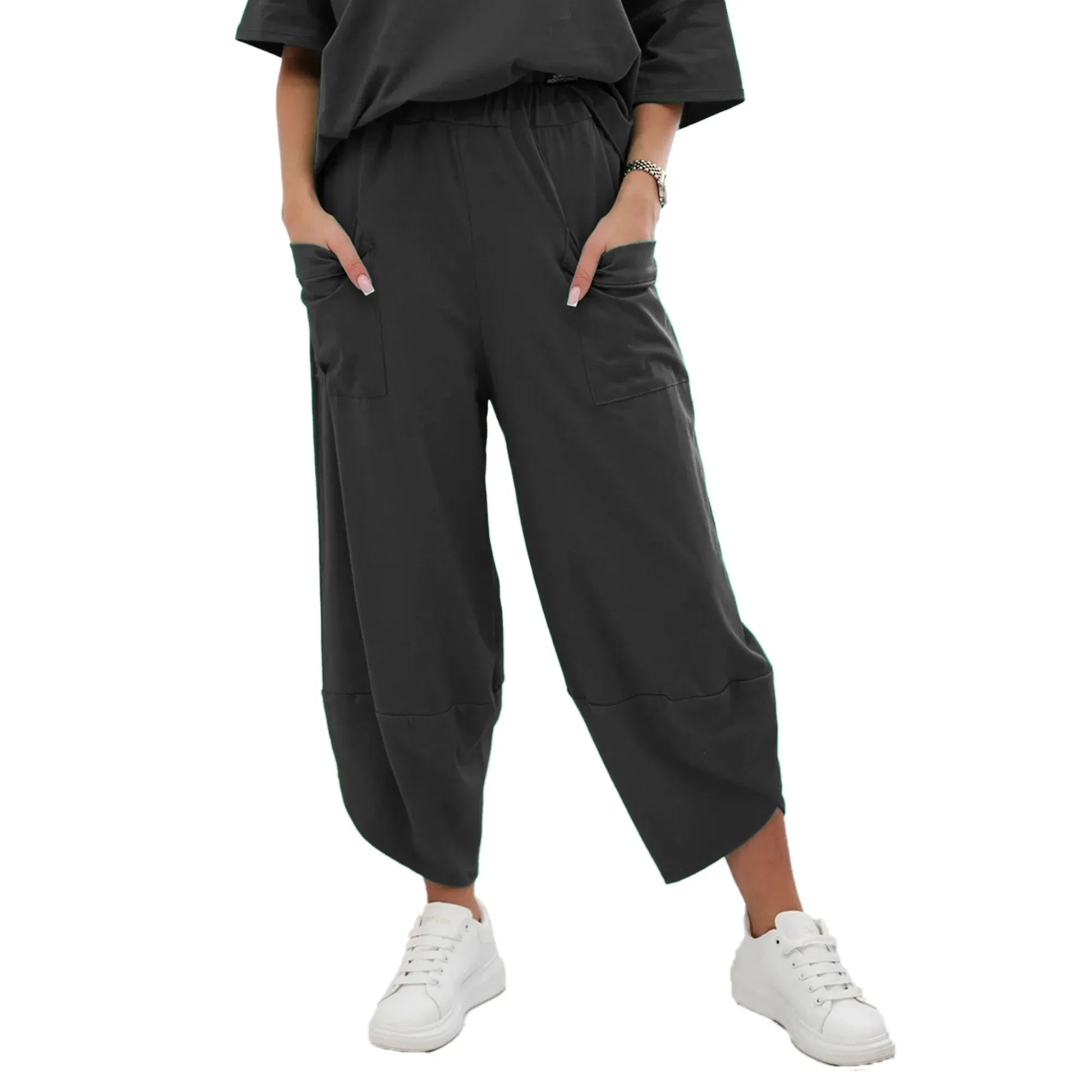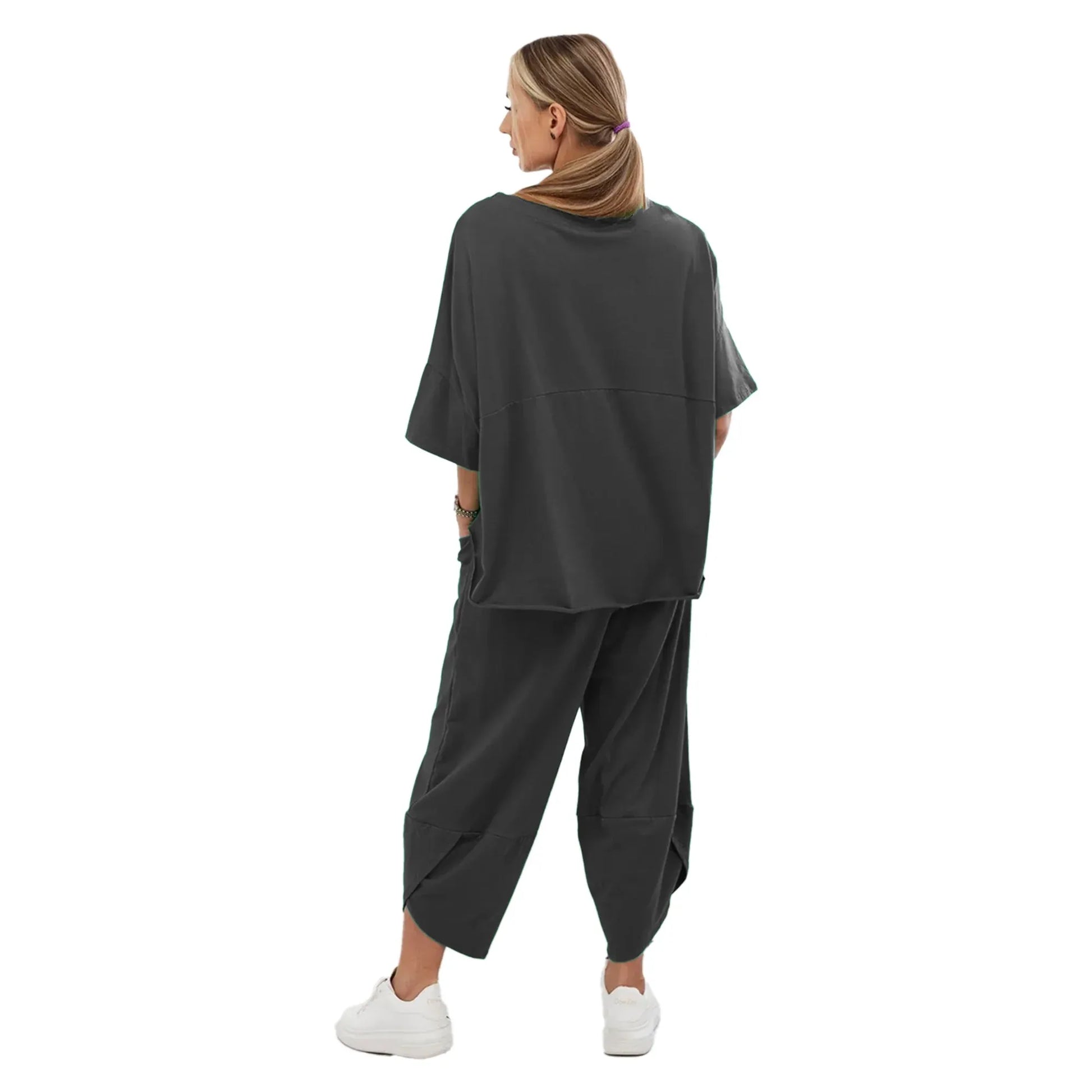 Relaxed Silhouette: Enjoy a roomy crew-neck top with dropped shoulders and flowing, wide-legged trousers featuring an adjustable waistband and discreet side pockets.